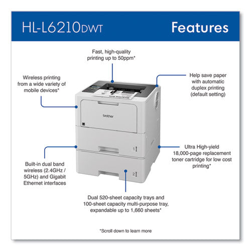 HL-L6210DWT Business Monochrome Laser Printer with Dual Paper Trays